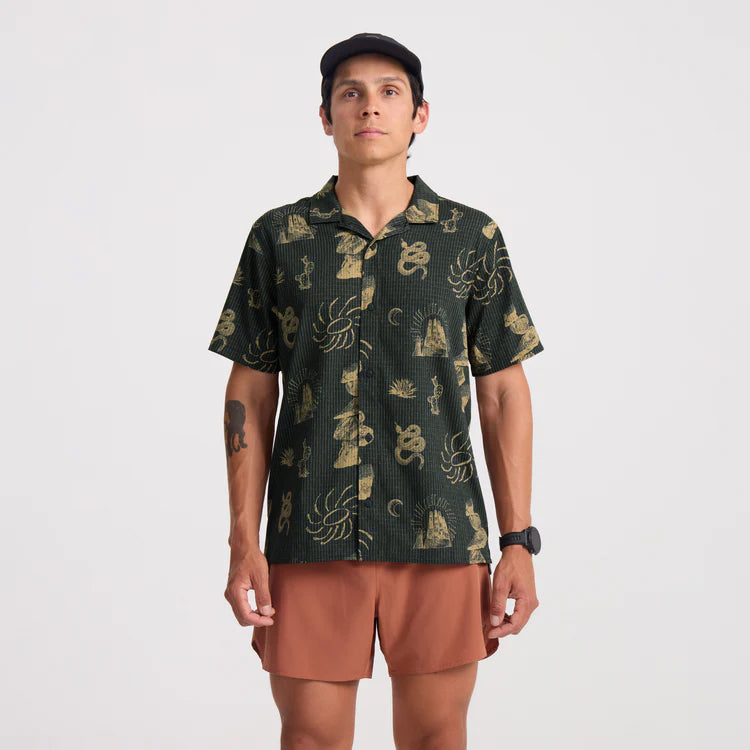 The Bless Up Trail has you completely covered from the trail to the bar for an icy post-run cerveza. Don't miss a step while bringing your style into the mountains. Built with a 4-Way stretch, microperforated, nylon Tactel/ poly blend, and rubber buttons, this technical button up is one of our most versatile garments in the Run Amok Collection.