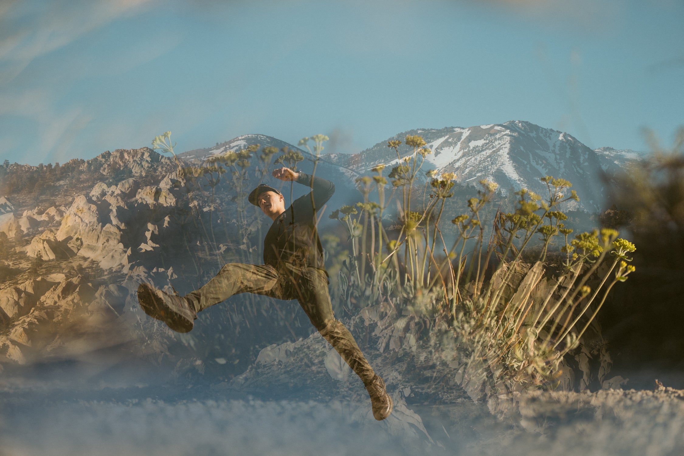Adventurer jumping over a snowy mountain range in the Bonneville HO24 scene, embodying the spirit of exploration and outdoor adventure with Roark.