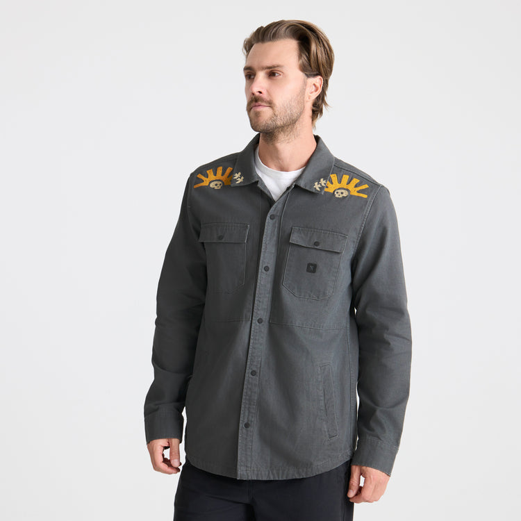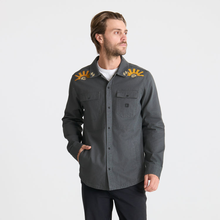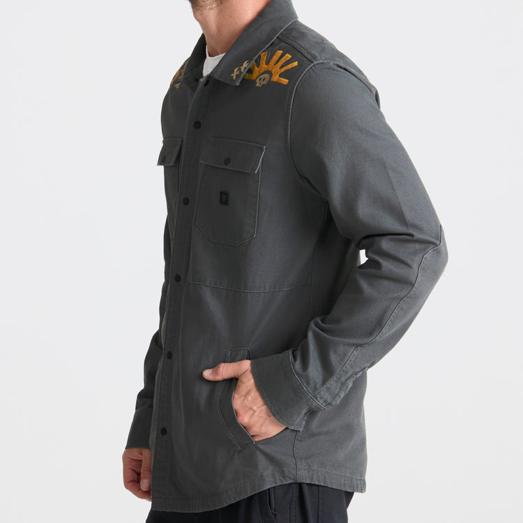 Introducing our latest addition to our contemporary casual wear collection. It is the lightweight version of our original Hebrides Jacket. Drawing inspiration from traditional workwear styling, the Hebrides Unlined is our modern take on the classic overcoat. Crafted from high-quality, durable fabric in a versatile olive green hue, it features unique, bright sun and playful flower patch embroidery that adds a touch of artistic flair. The relaxed fit allows for ease of movement, making it perfect for both outdoor adventures and casual urban outings. Made from 100% Organic Cotton Canvas, with reinforced elbow panels.