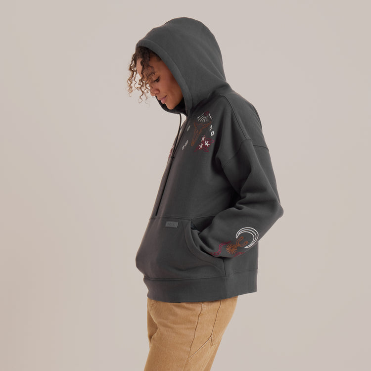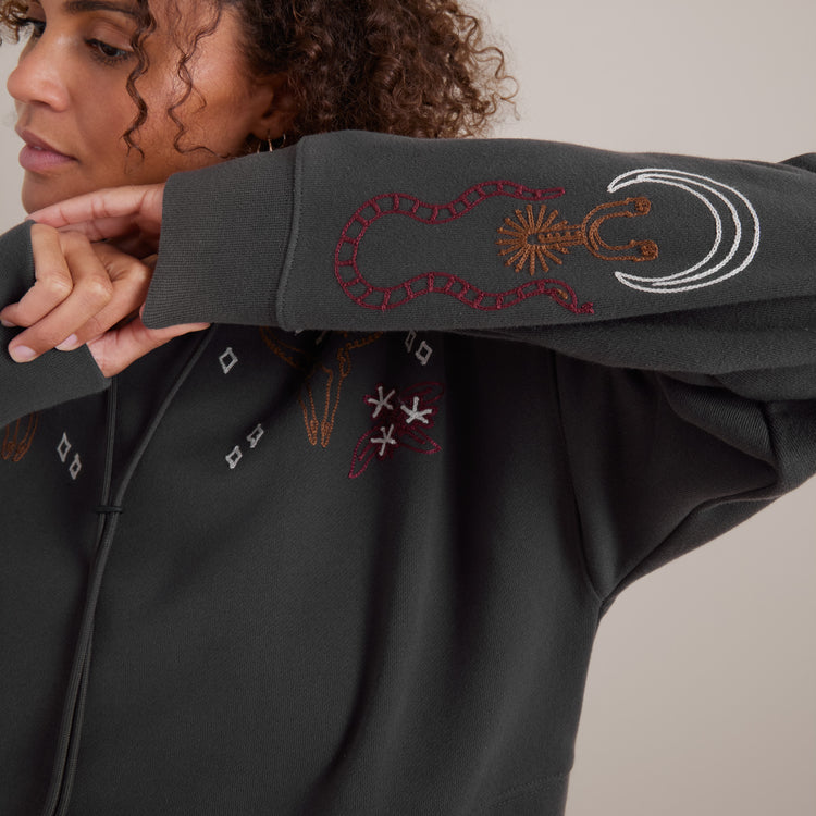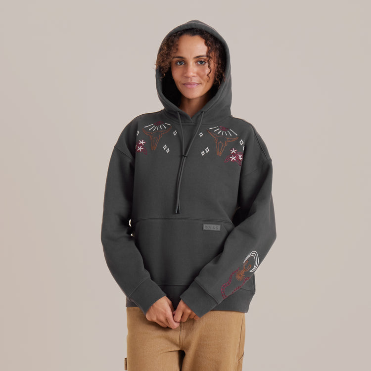 A hoodie as bold as you, featuring an oversized cut and mixed media embroidery and chenille art for the ultimate statement piece around the campfire.