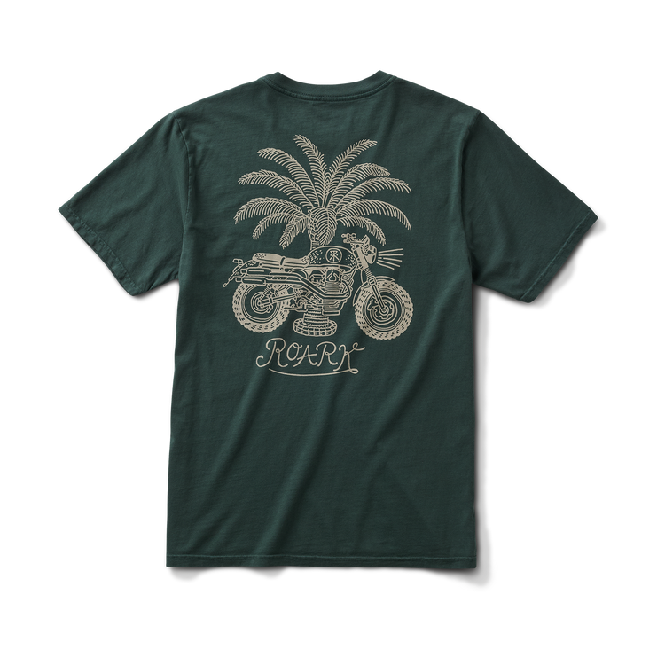 Hit the road with the spirit of adventure in the Moto graphic tee. This standard fit black short sleeve t-shirt features a subtle palm tree and Roark logo detail on the front, while the back showcases an intricately drawn motorcycle under a towering palm. Crafted from soft, durable cotton, this shirt is designed to keep up with your travels.