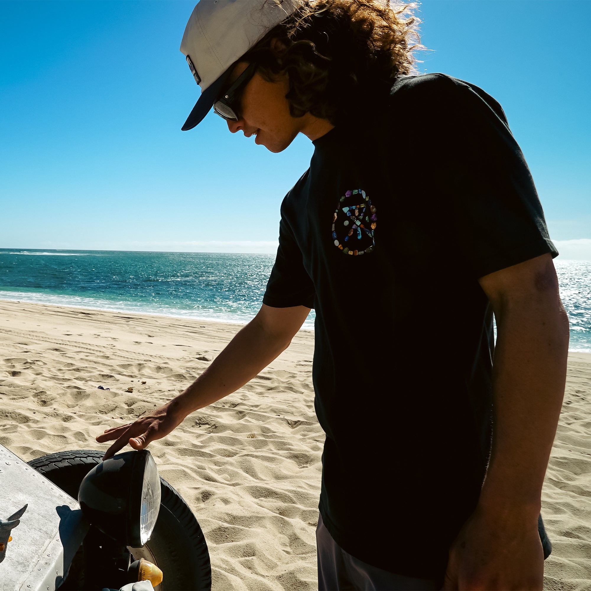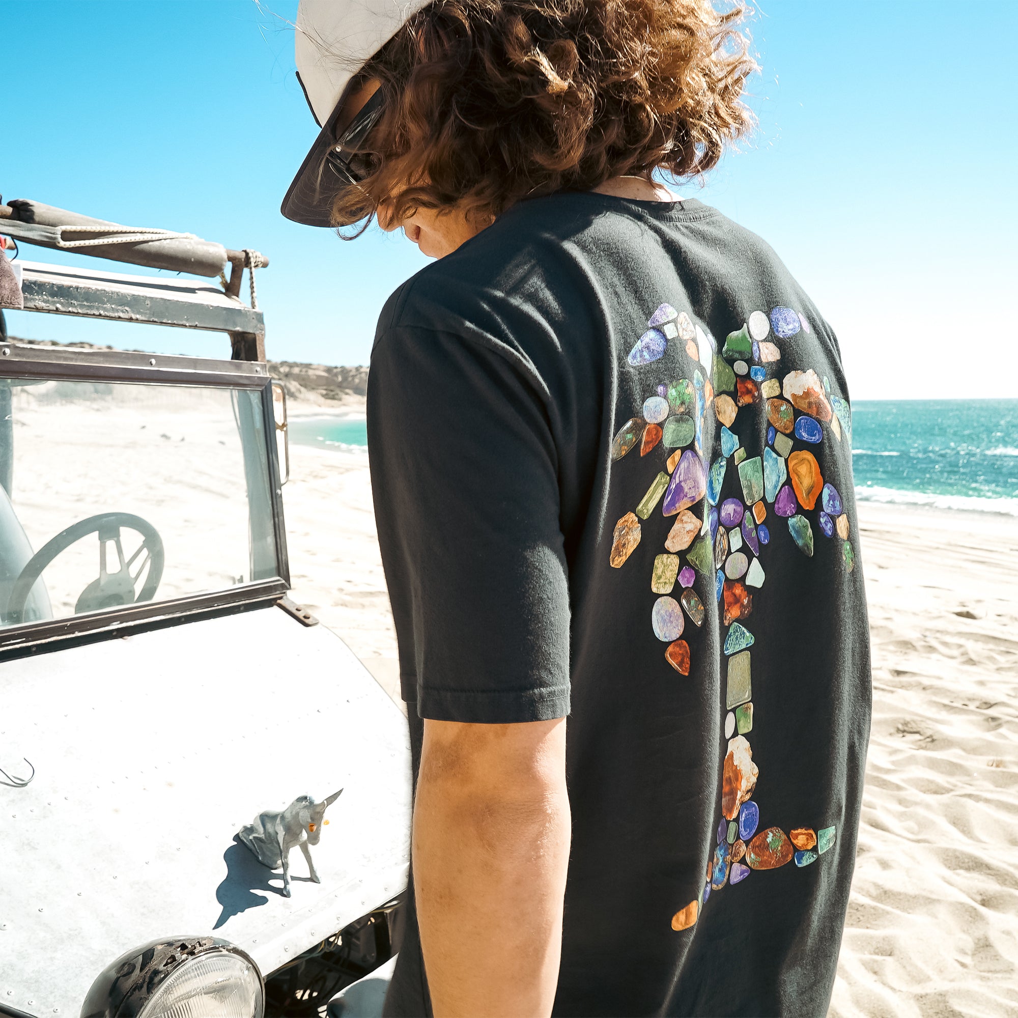 Crafted from premium soft cotton, this black graphic t-shirt features a palm tree design made of colorful gemstones on the back, paired with a subtle Roark logo on the chest.