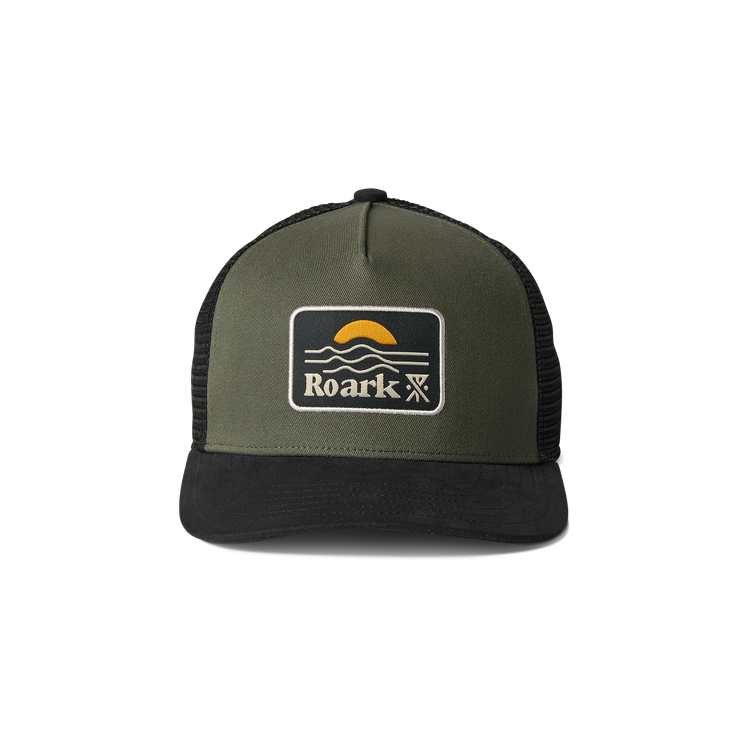 Roark Station Trucker Snapback Hat in Military Green, a classic hat with a modern twist. This image highlights the hat's stylish and durable design.